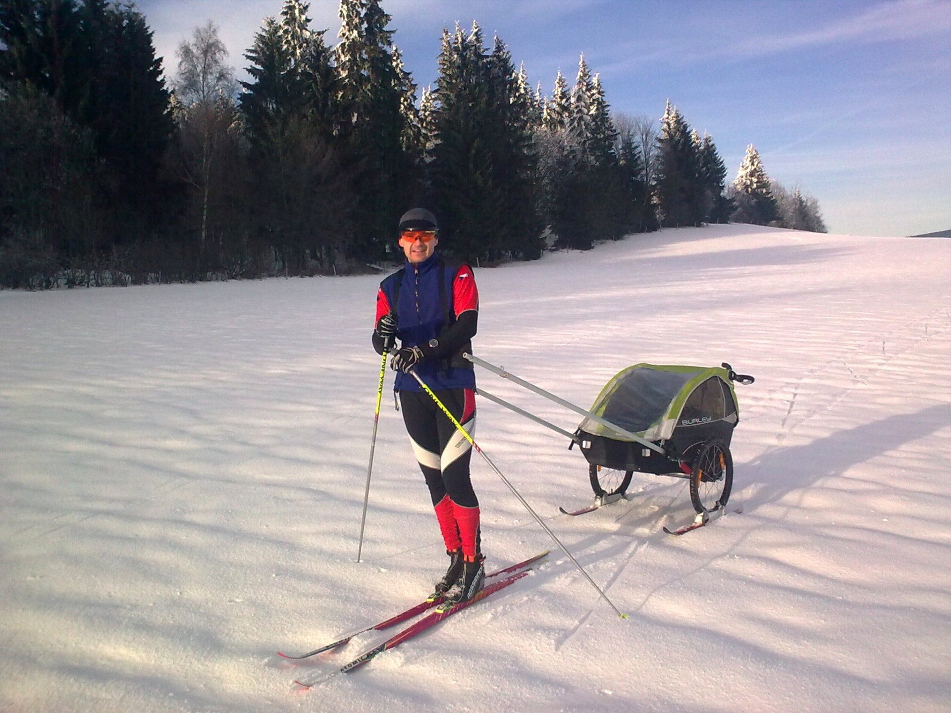 Přišla zima a tak jsme si půjčili od známých lyžařský set. Napadlo trochu sněhu a jelikož jsem vášnivý lyžník, vyrazili jsme s vozíkem do stopy. Musím říct, že požitek to není, ale člověk se unaví, zalyžuje si a navíc je i s rodinou. Jen do prudších stoupání to moc nejde, přece jenom váha vozíku i s potomkem Vás táhne zpátky pod kopec. Většinou jsem na lyžích bruslil, můj otec zkoušel vozík i na klasiku a pokud nebyl větší kopec, neměl s ním problém. Troufl jsem si zapřáhnout vozík i při skialpovém šlapání na Lysou horu, samozřejmě po asfaltové cestě. Výšlap byl v pohodě a sjezd po cestě také, vozíček sice trochu vybočoval, ale když se člověk drží na uzdě, nepřevrhne se.